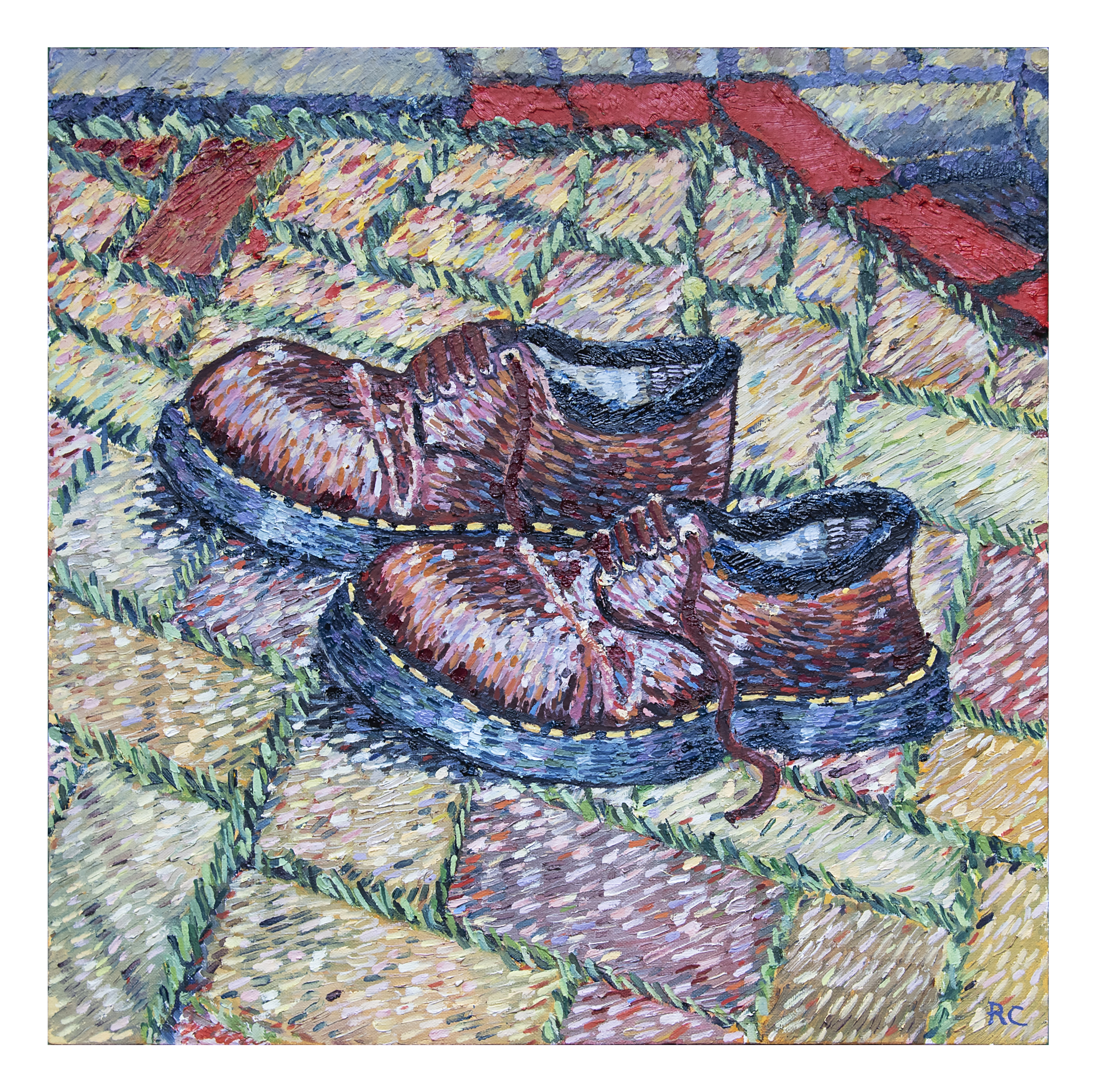 Latest painting ‘Shoes on Brickwork’ is the first thing I have painted outside. It feels as though the pallet has naturally changed to slightly cooler colours. It took me, on and off, a month or so and I was sat in the small enclosed outside area of my house.