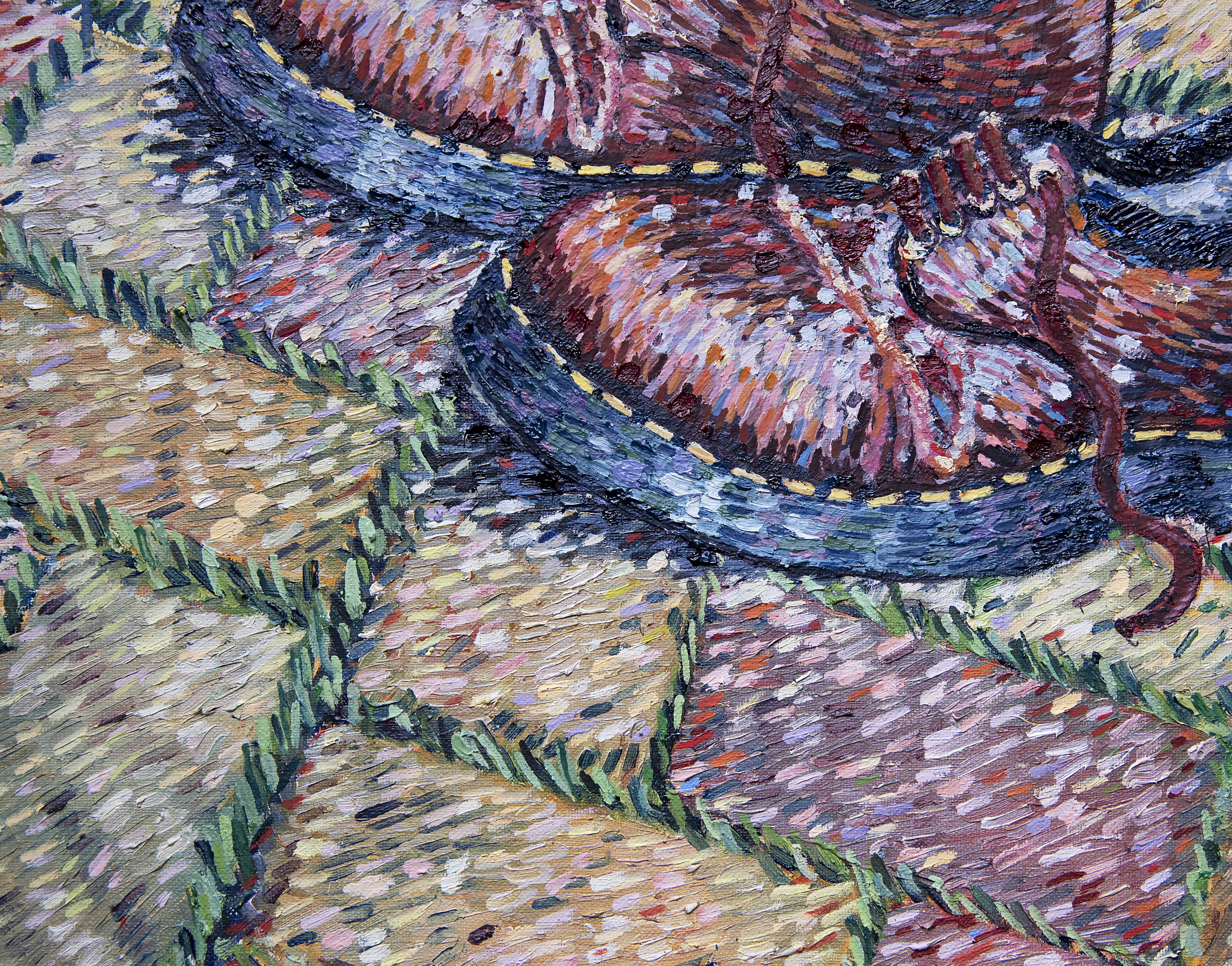 I really enjoyed painting the brickwork, especially the ones closest, the surfaces really started to breakdown for me and thats where this broken brush-stoke thing came from. There were no intentional decisions made here, but I haven’t used any blending, which is quite interesting, I think it helps get describe the intensity of the sunlight hitting the different surfaces, the leather of the shoes or the old, mossy bricks.